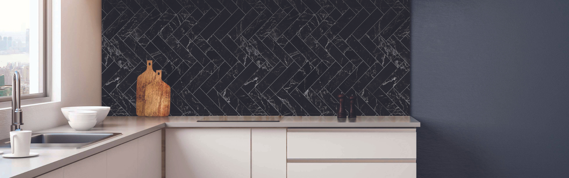 Tile splashbacks are timeless. Whether referencing mosaics from ancient Moroccan bazaars, or evoking New York subways, the Tile Collection recreates such classic effects while alleviating the burden of grimy grout lines associated with real tile splashbacks.
